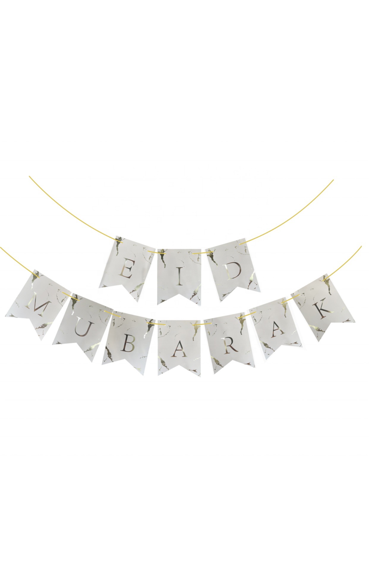 Eid Mubarak banner i vit med guldbokstäver och guld mönster.