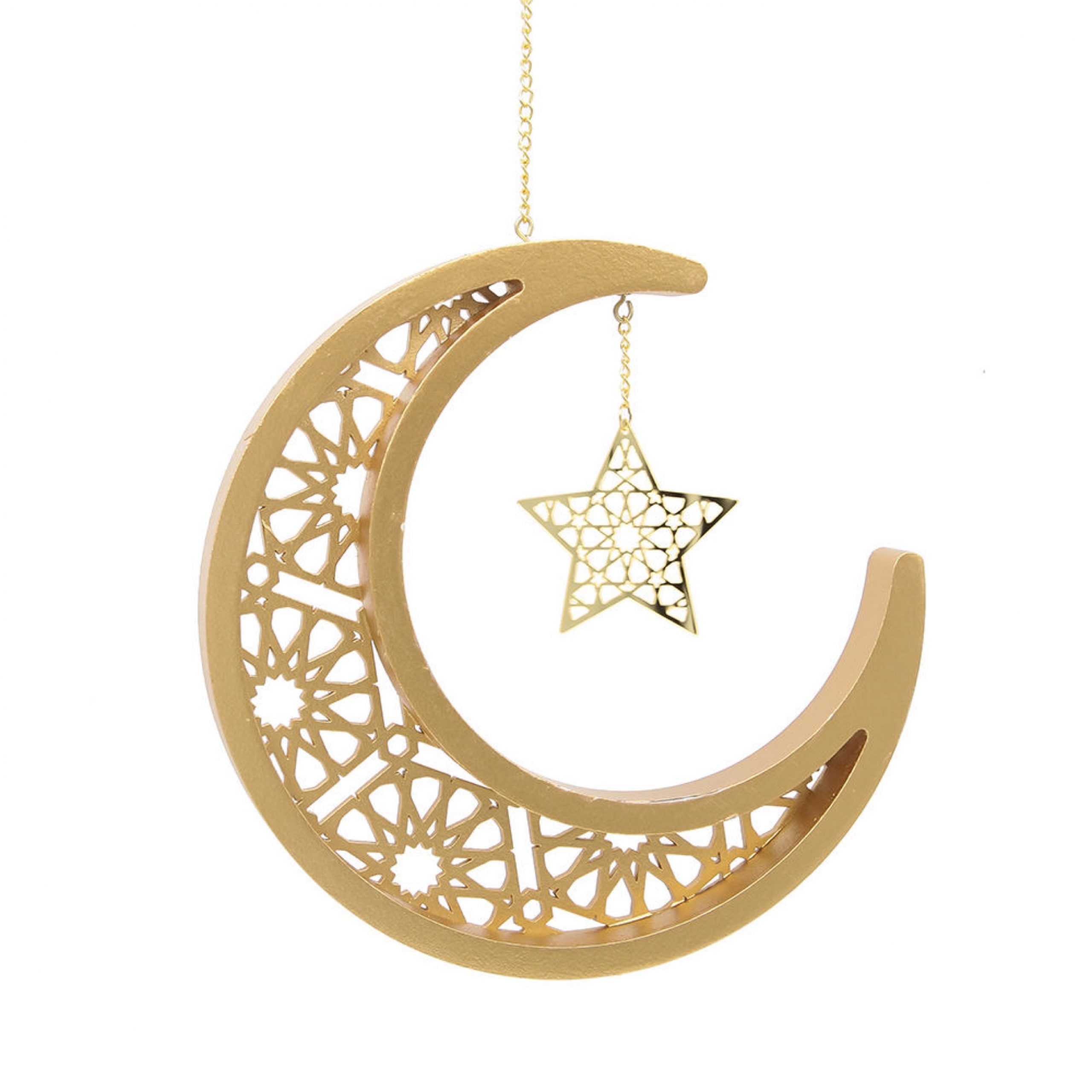 Hängdekor halvmåne & stjärna 3D i trämaterial med guldkedja